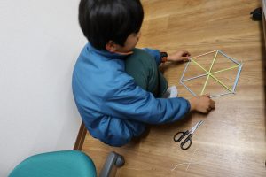 そしていよいよ、ストローとモール(の代わりに丸ゴム)を使って平面・立体図形づくりに挑戦しました。