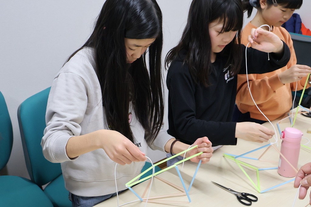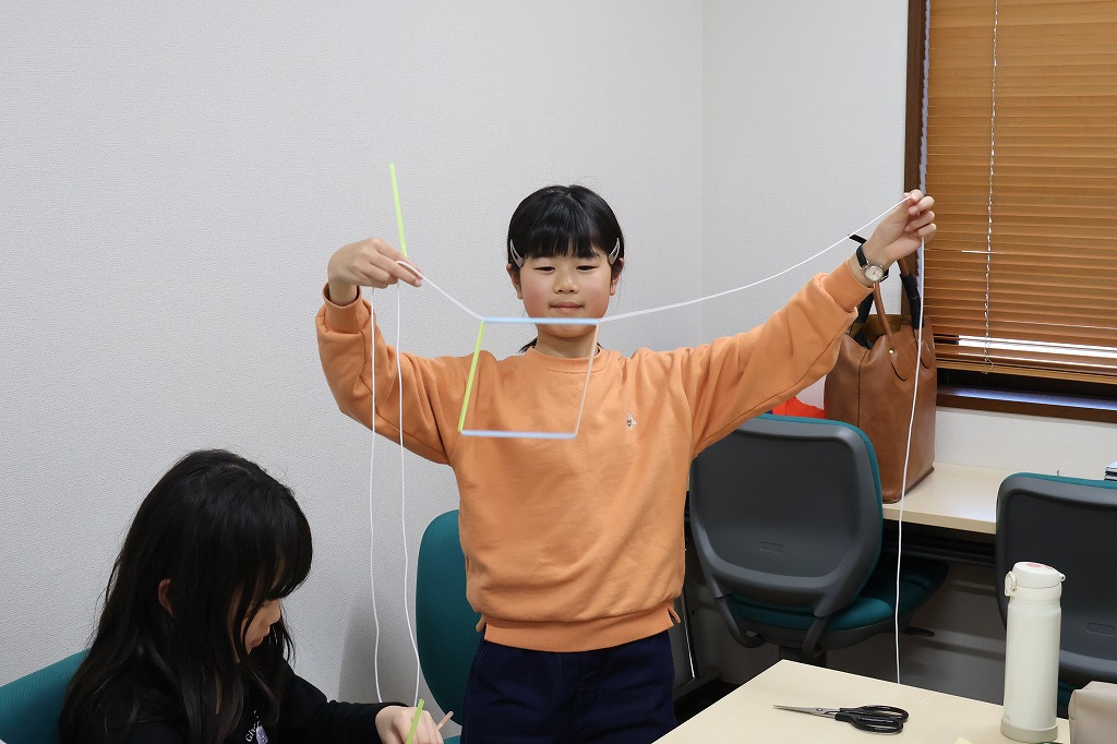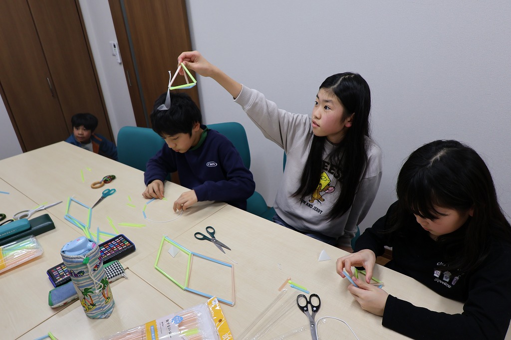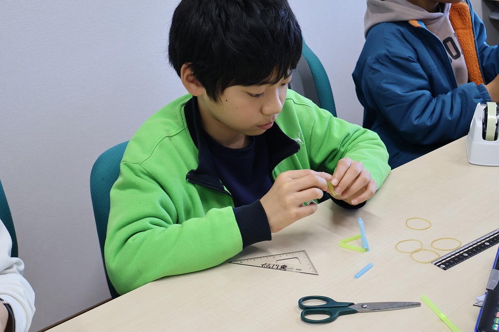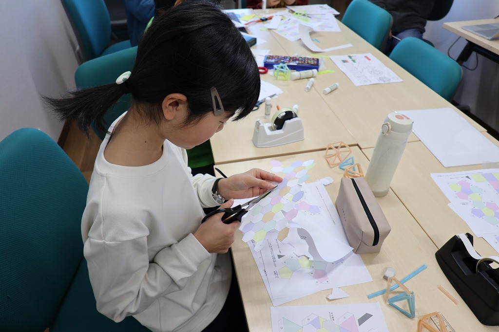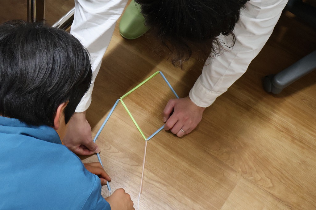 どうすれば六角形、四角形、ひし形、四角錘などの形がつくれるのか、実際に手を動かしながら考えました。